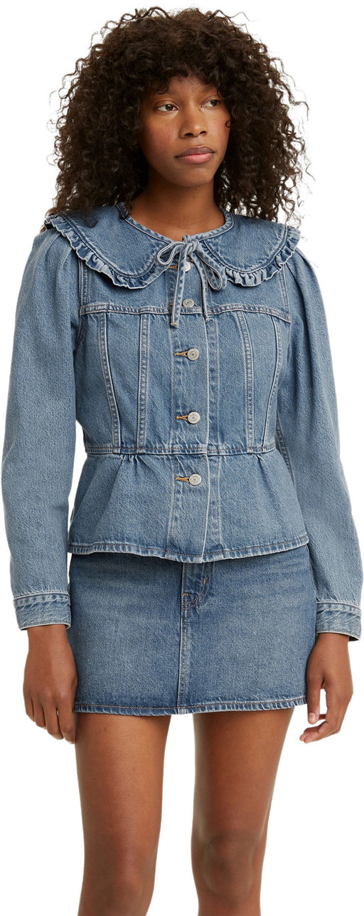 В этой модели Prairie Trucker от Levis сочетаются джинсовая куртка Trucker Jacket и блузка в романтичном стиле. Благодаря объемному воротнику с оборками, завязке из той же ткани и рукавам-фонарикам эта новая модель невероятно элегантна. Двусторонний воротник создает эффект двух курток в одной. Новая женственная модель нашей легендарной куртки Trucker Jacket. Съемный супербольшой воротник. Женственные детали: оборки, завязки и объемные рукава.