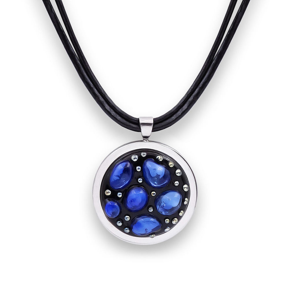 Колье изготовлено из натуральной кожи, муранского стекла и гипоаллергенной ювелирной стали, что очень важно для людей с чувствительной кожей. Металл не темнеет и не подвергается воздействиям окружающей среды, надолго обеспечивая красивый внешний вид изделия. Длина колье - 46 см + 5 см. удлиняющая цепочка. Диаметр стеклянного элемента - 2,5 см. Вес - 19 гр.­