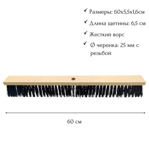 • Щетка тротуарная деревянная 60х5,5х1,6см, щетина 6,5см, с резьб.наклонн.отверстием под черенок d25мм