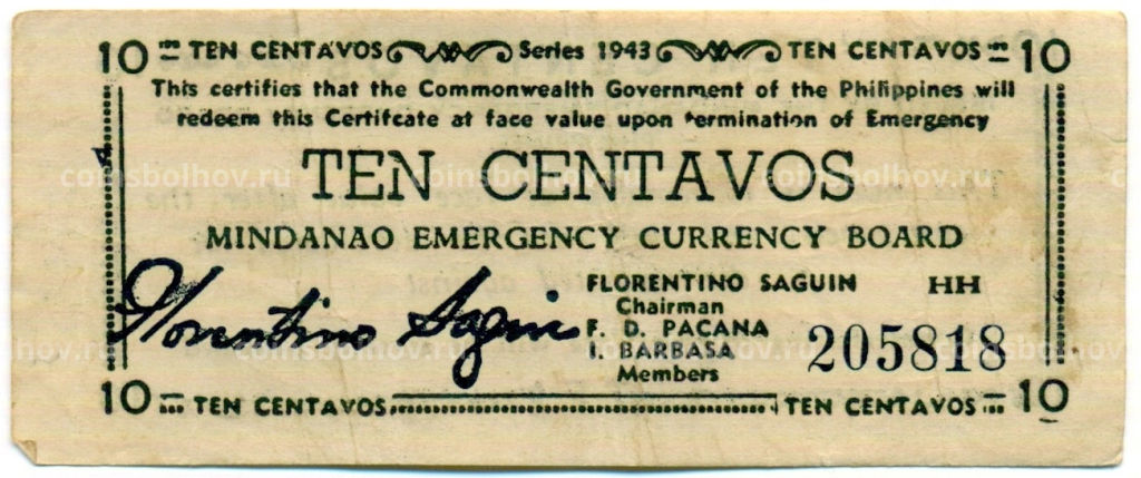 • Банкнота 10 сентаво 1943 года Филиппины (Минданао, Администрация США)