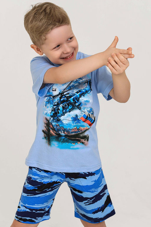 Костюм из кулирки для мальчиков футболка + шорты. Светлая футболка с принтом в виде изображения вертолета. Шорты в дизайне «милитари», по бокам карманы, длина чуть ниже коленей. Может быть парой мужскому костюму Вертолет (продается отдельно). Рисунок камуфляжа может немного отличаться