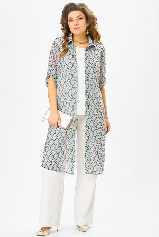 Кардиган нарядный из креп-шифона "Димия"  прямого силуэта, с застежкой на петли и пуговицы. Кардиган выполнен и высококачественной ткани с цветочным принтом. Край борта обработан планкой. Воротник отложной со стойкой рубашечного типа. Рукав одношовный, втачной. Низ рукава обработан планкой. По боковым швам разрезы. Низ изделия обработан швом в подгибку закрытым срезом.