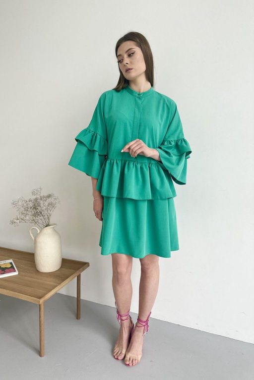 Платье оверсайз с двухъярусной юбкой,коротким рукавом с двумя волнами, с закрытой планкой по переду­