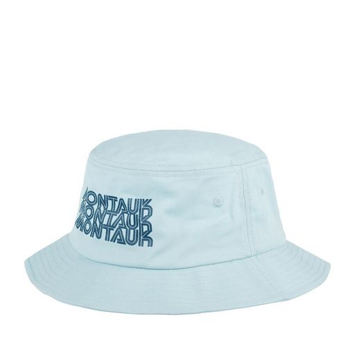 Американская панама MONTAUK из серии Twill Screen Bucket. Панама сшита из плотного светло-серого хлопка. Спереди головной убор украшает тройная надпись Montauk. Монток — административная единица США, расположенная в округе Саффолк с населением около 3000 человек. Для вентиляции в панаме предусмотрены люверсы. Ширина полей – 5,5 см, глубина – 8 см.