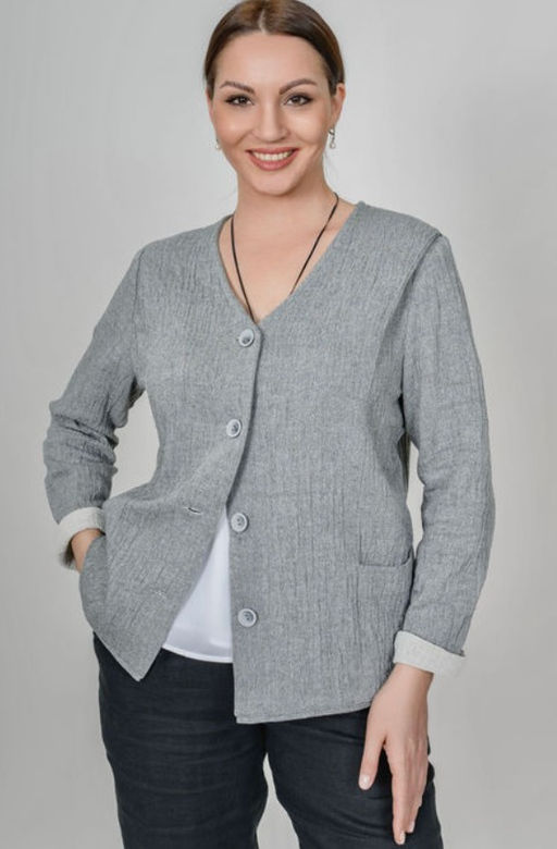 Летний классический жакет из муслина (100% хлопок) с эффектом крэш. Рукав втачной, имеются 2 кармана. Крой с нагрудной вытачкой обеспечивает отличную посадку на фигурах большой полноты. Изделие отлично впитывает влагу и обеспечивает комфорт в жаркое время года.