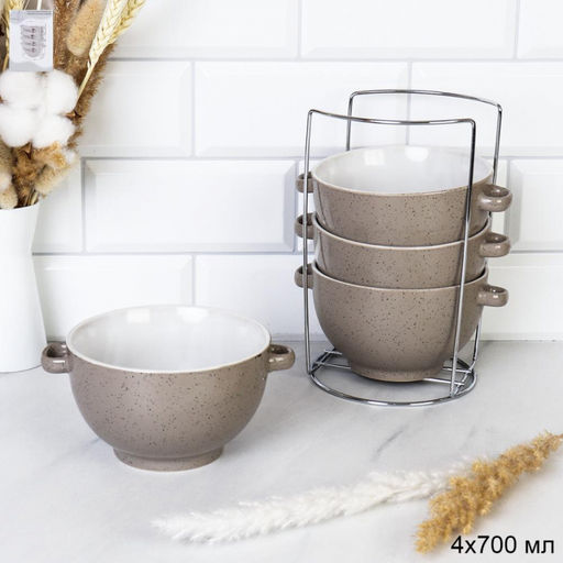 Набор из 4-х бульонниц с ручками выполнен из высококачественной керамики. Посуда компактно располагается на оригинальной металлической подставке и не занимает много места при хранении на кухне. Бульонницы подойдут для подачи горячих бульонов, каш и других блюд.