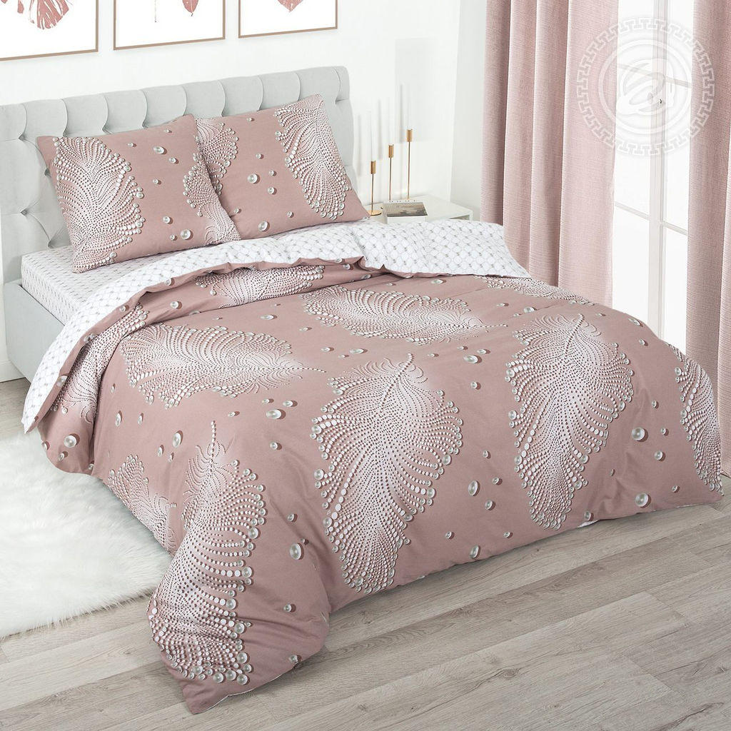 "Ожерелье" постельное белье с перьями, которое ассоциируется с легкостью и утонченностью. На нем авторский принт с жемчужными бусинами в пастельной цветовой гамме. Комплект из поплина с нежным дизайном сделает спальню элегантной!