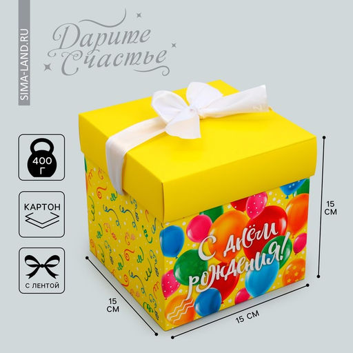 Форма: Куб. Форма: Квадратная. Плотность, г/м²: 250. Тематика: Воздушные шары. Тематика: Праздник. Символ года: Нет. Тематика праздника: День рождения. Вид: Складные коробки. Размер: Малый (11-17 см). Бесплатная доставка: Да. Наша разработка: Да. Размеры товара: 15/15/15.