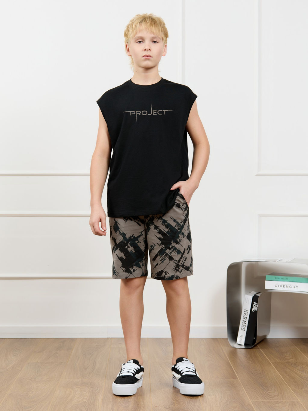 Костюм для мальчика, состоящий из майки и шорт. Майка однотонная с принтом на груди; модель свободная, со спущенной линией плеч и углубленной проймой. Шорты из полотна с набивным рисунком эксклюзивного дизайна, с боковыми карманами с обтачными входами, на притачном поясе с отстроченной эластичной тесьмой.­