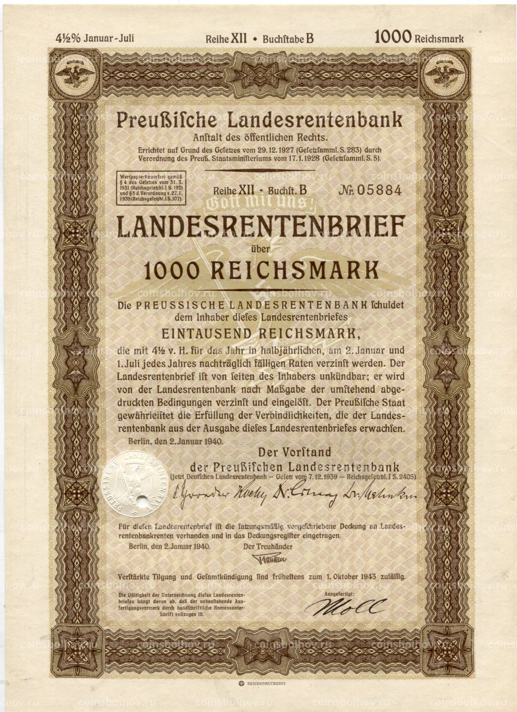 • Облигация 4,5% 1000 рейхсмарок 1940 года Германия