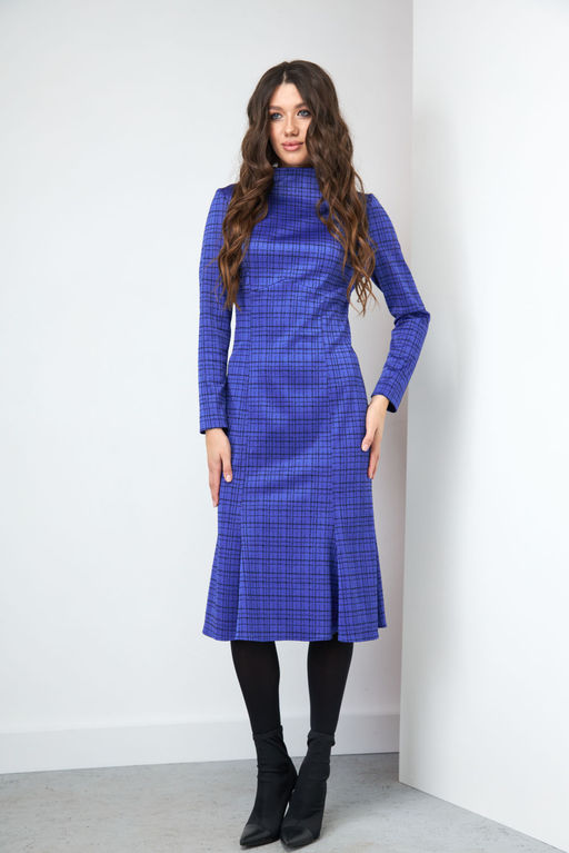 Платье прилегающего силуэта, состоящее из отрезного лифа с фигурной завышенной линией талии по полочке и спинке и шести вертикальных прилегающих клиньев по линиям фигуры расширенных к низу в форме "jupe a godet" (юбка-годе). Горловина платья имеет цельнокроеную стойку 3,5 см. На спинке платья в среднем шве расположена застежка: потайная молния. Рукав одношовный облегающий. Длина рукава 58 см. Длина платья 111 см.