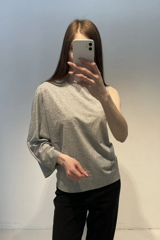 Джемпер из эластичного полотна с люрексом свободного силуэта. Изделие оригинального кроя с одним цельнокроеным рукавом. Круглый вырез горловины и линия проймы окантованы эластичными бейками.