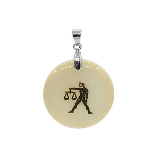 Круглый кулон выполнен из белого перламутра с золотистым рисунком знака зодиака Весы. Диаметр кулона 30мм.
