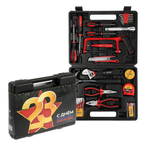Полный комплект для домашнего мастера в праздничном оформлении! Подарочный набор инструментов 23 Февраля на 31 предмет это солидный арсенал для решения большинства бытовых задач. Набор сочетает функциональность и статусный внешний вид, что делает его желанным подарком к любому мужскому празднику.