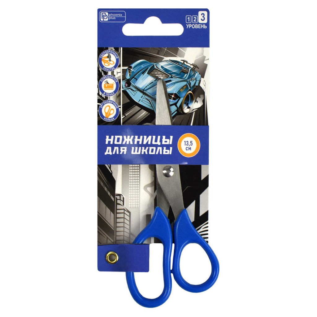 Ножницы для детей Феникс+, арт.66047/ 24 ГОНКИ (синий, 13,5х5,6 см, длина лезвия: 5 см, нержавеющая сталь, асимметричные, универсальные, картонная подложка с европодвесом)