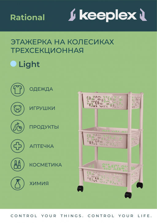 Этажерка Keeplex Light на колесиках трехсекционная прямоугольная 37х29х69 см - это эффективное и недорогое решение для организации хранения в небольших помещениях, на кухне, в ванной, на балконе или лоджии, в кладовой или на даче. Отличительная особенность этажерки - высокие бортики, которые позволят сохранить вещи в безопасности. Напольная этажерка состоит из трех полок. Габариты этажерки в собранном виде 370х290х690 мм, она собирается без инструментов за несколько минут, достаточно соединить стойки и полки, вставить ножки и заглушки. Вместительные полки применяются для хранения большого количества хозяйственных мелочей. На нижних ножках предусмотрены колесики, ее легко выдвигать и устанавливать на место.