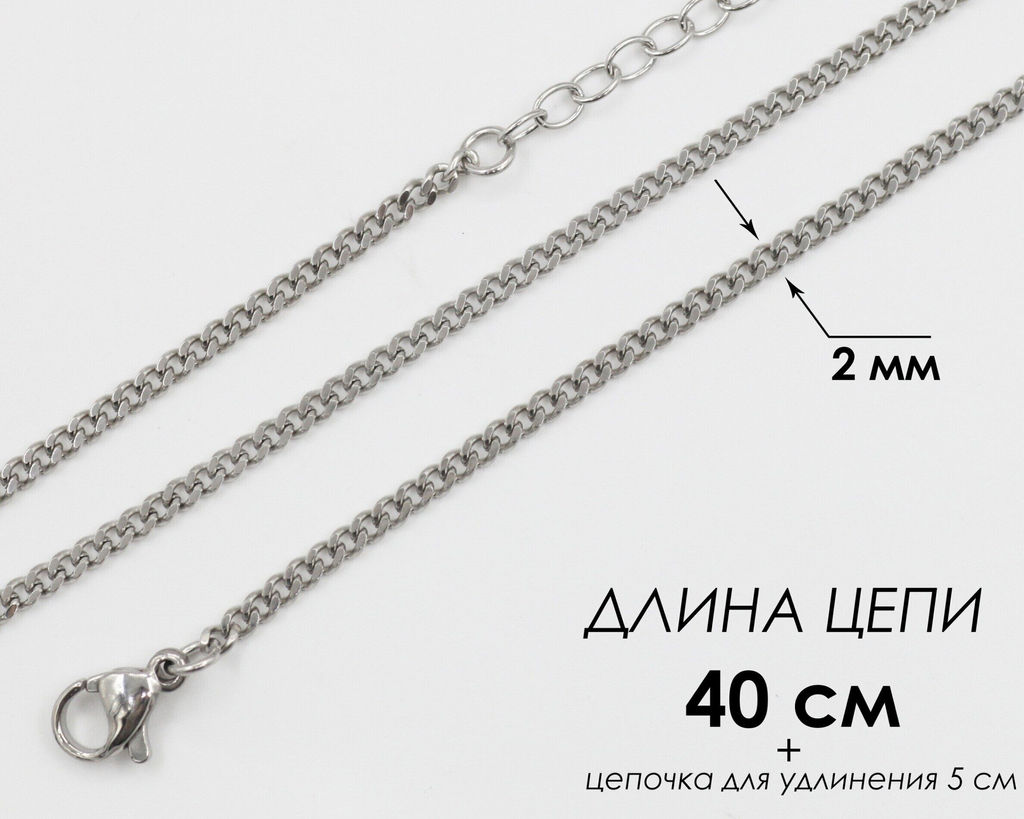 Цепь изготовлена из стали. Размеры: длина цепи: 40 см + цепь для удлинения 5 см звено: 0.2 см;