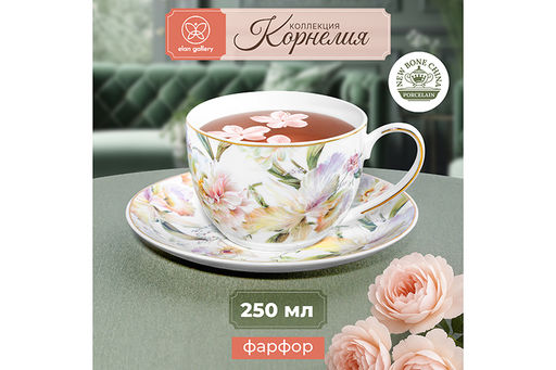 Чайная пара из серии Корнелия от Elan Gallery предназначена для эстетичной сервировки вашего стола. Размер изделия 12,5х9х6,5 см, объём 250 мл. Размер блюдца 15,3х15,3х2 см. Изготовлены из фарфора нового поколения new bone china, сочетающего в себе изящность и высокую прочность. За счёт гладкости изделия легко отмываются, поэтому сохраняют привлекательный внешний вид и практичны в использовании. Плотная структура материала позволяет посуде дольше сохранять температуру блюд и напитков. От других видов костяного фарфора new bone china отличается большей экологичностью в производстве. Поверхность изделий овивают изображения обворожительных белых пионов. Они выполнены в манере, вдохновлённой акварельным рисунком. Тонкая золотистая окантовка служит деликатным акцентом и подчёркивает их изысканность. Кофейная кружечка поможет провести множество приятных завтраков с капучино и латте, а также уютные чайные вечера с конфетами, вафлями, другими десертами и сладостями. Подойдёт ценителям чая и кофе, которые любят пить из красивой и необычной посуды. Согрейтесь зимой любимым напитком: какао с маршмэллоу, ягодным чаем или горячим шоколадом. Летом освежитесь домашним лимонадом или морсом. Используйте сервировочное блюдце как подставку для чашки или заполните пирожным, кусочком торта или домашнего пирога. Подойдёт для закусок: сырной нарезки, сырокопчёной колбасы или свежих овощей и зелени. Декоративный комплект позволит организовать запоминающееся чаепитие. Не рекомендуется применять абразивные моющие средства. Не подходят для использования в посудомоечной машине и микроволновой печи. Поставляются в подарочной упаковке. Фарфоровая сервировочная посуда будет оригинальным подарком для хозяйки, ценящей не только практичность, но и привлекательность. Серия Корнелия от бренда Элан Галерея добавит вашему кухонному инвентарю лёгкости и элегантности, преобразив любую сервировку!