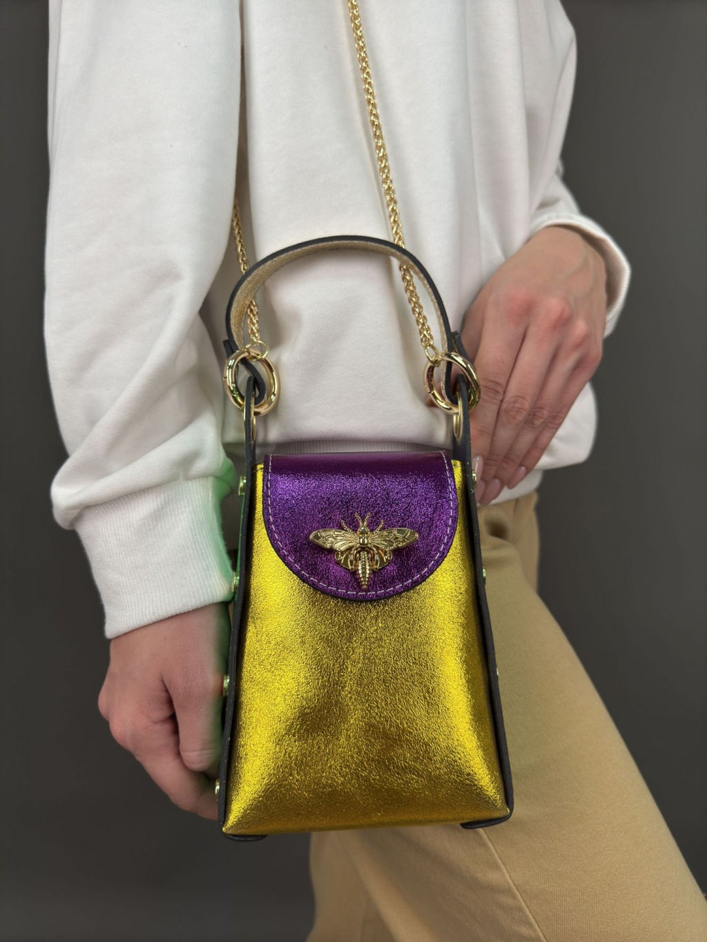 Можно носить в руке, либо на изящной цепочке через плечо - очень удобно!