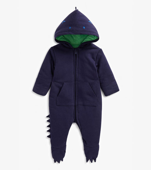 Распродажный ассортимент - это остатки коллекций, выставочные образцы с витрины, товары без упаковки, восстановленные или пользующиеся низким спросом изделия, а также продукция с незначительными дефектами внешнего вида (царапины, потертости и другие особенности). Обращаем ваше внимание, что продукция данной категории возврату и обмену не подлежит. Приобретая товары из распродажного ассортимента вы соглашаетесь на наличие дефектов во внешнем виде или упаковке. - 100% Хлопок_Мягкий комбинезон с капюшоном и с ватной набивкой, в синем цвете, в дизайне "Динозаврик" с объемными элементами.­