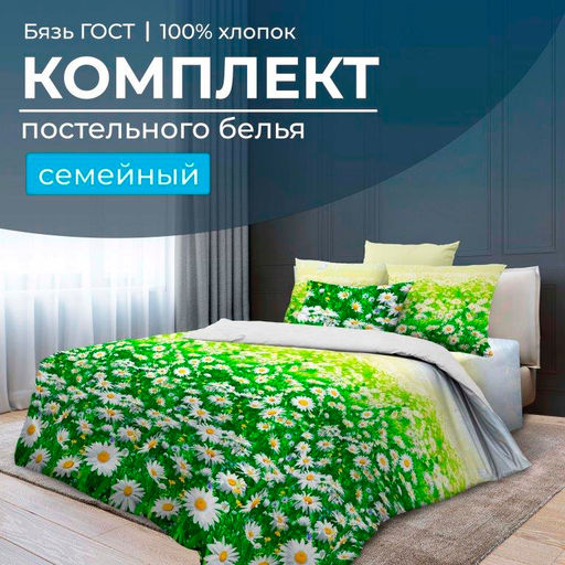 Семейный комплект с двумя 1,5-спальными пододеяльниками из бязи ГОСТ, плотностью ткани 140 г/м2. Ткань плотная, лощеная, высочайшего качества. Иногда про неё говорят, что это ткань, «как раньше была». И правильно говорят! Такая ткань имеет длительный срок службы, рисунки на ней смотрятся четко и выразительно. У этой ткани абсолютно натуральный состав - хлопок 100 %, она очень комфортна, экологична, не деформируется, хорошо впитывает влагу, позволяет коже дышать, что способствует вашему полноценному отдыху! В комплекте: два пододеяльника размером 150 * 215 см (вход в пододеяльник выполнен в нижнем шве – прорезь длиной 70 см), простыня размером 240 * 220 см, две наволочки размером 70 * 70 см на клапане глубиной не менее 25 см. Мы используем только натуральные материалы, а наши опытные специалисты обеспечивают качественный пошив. Наши изделия произведены в Ивановской области, имеют сертификацию качества "ГОСТ 31307-2005", а также зарегистрированы в государственной системе маркировки "Честный знак". -- Характеристики -- Вес: 3100 кг Размерность комплекта: Семейный Комплектность: 2 пододеяльника, 1 простыня, 2 наволочки Количество предметов в комплекте: 5 Размерность пододеяльника: 1,5 спальный Размер пододеяльника: 150x215 Кол-во пододеяльников в комплекте: 2 Замок пододеяльника: С прорезью Длина прорези (см): 70 см Размерность простыни: Евро Размер простыни: 240x220 Размер наволочки: 70x70 Замок наволочки: С клапаном Кол-во наволочек в комплекте: 2 Ткань: Бязь ГОСТ Состав: 100 % хлопок Плотность: 140 г/м2 Плотность плетения: Высокая Отделка: Без отделки Режим стирки: При 40 градусах Цвет: Зеленый Расцветка: Ромашковое поле Вид принта: Ромашки Целевая аудитория: Взрослая