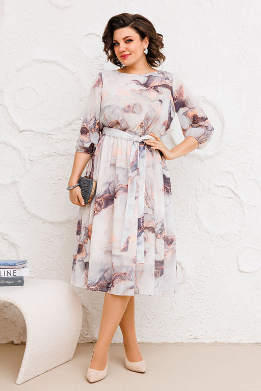 Роскошное женское платье полуприлегающего силуэта, расширенное к низу, выполнено из высококачественного шифона с модным дизайнерским принтом. Платье отрезное по талии со сборкой на резинке, полностью на трикотажной подкладке. Вырез горловины округлый, на обтачке. Рукава втачные, по низу собраны на узкую резинку. В комплект входит пояс из основной ткани. Модель платья удобная и практичная, прекрасно подойдет для ежедневной носки, а также для торжественного мероприятия.­
