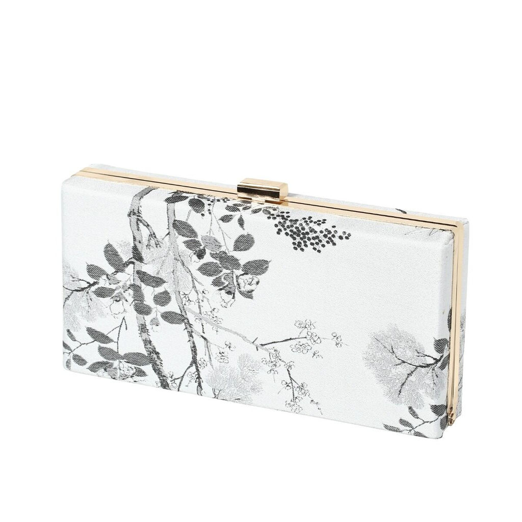 Лаконичный стильный клатч-минодьер с золотистым фермуаром. Романтичный флоральный принт в оттенках серого по белому полю. Клатч удобно лежит в руке, в нем без труда помещаются смартфон, кредитки, косметика, ключи и другие нужные вещи.