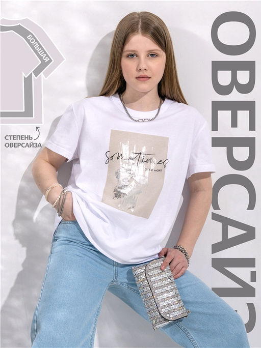 футболка,хлопок 100%,кулир / хлопок 100%,белый / - / Бежевый прямоугольник / - / - / -,Оверсайз футболка для девочки выполнена из кулира - легкого хлопкового полотна. Изделие прямого покроя с короткими рукавами и округлым вырезом горловины, украшено дизайнерским принтом. Уход: только машинная стирка (руками не стирать!) при температуре 40 градусов, без предварительного замачивания. Изделия с печатью перед стиркой необходимо вывернуть на изнаночную сторону.