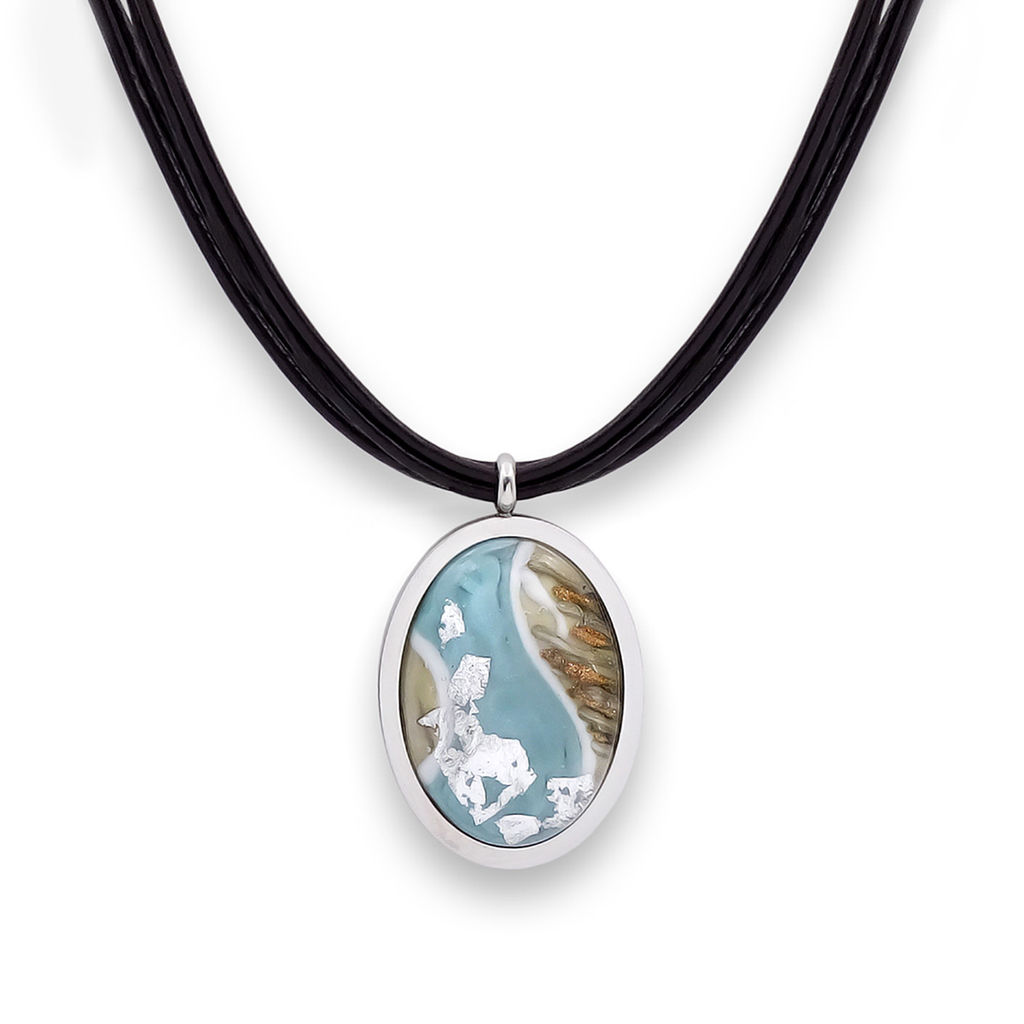 Колье изготовлено из натуральной кожи, муранского стекла и гипоаллергенной ювелирной стали, что очень важно для людей с чувствительной кожей. Металл не темнеет и не подвергается воздействиям окружающей среды, надолго обеспечивая красивый внешний вид изделия. Длина колье - 46 см + 5 см. удлиняющая цепочка. Размер стеклянного элемента - 4х3 см. Вес - 22 гр.­