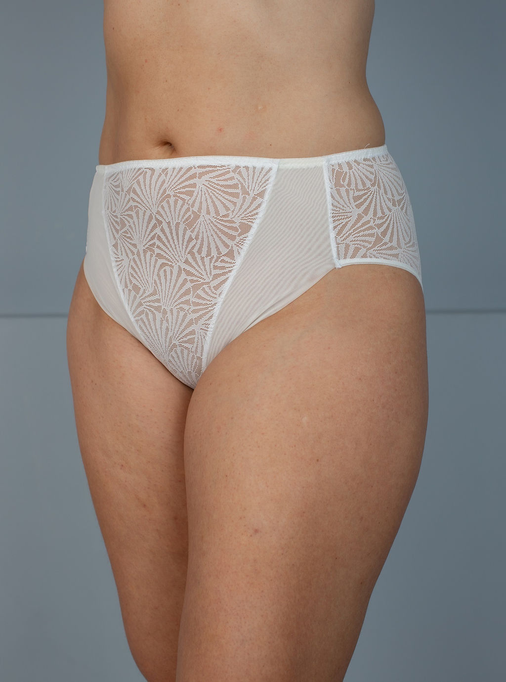 Трусы с высокой посадкой, выполнены из эластичного и мягкого кружевного полотна и эластичной сетки.