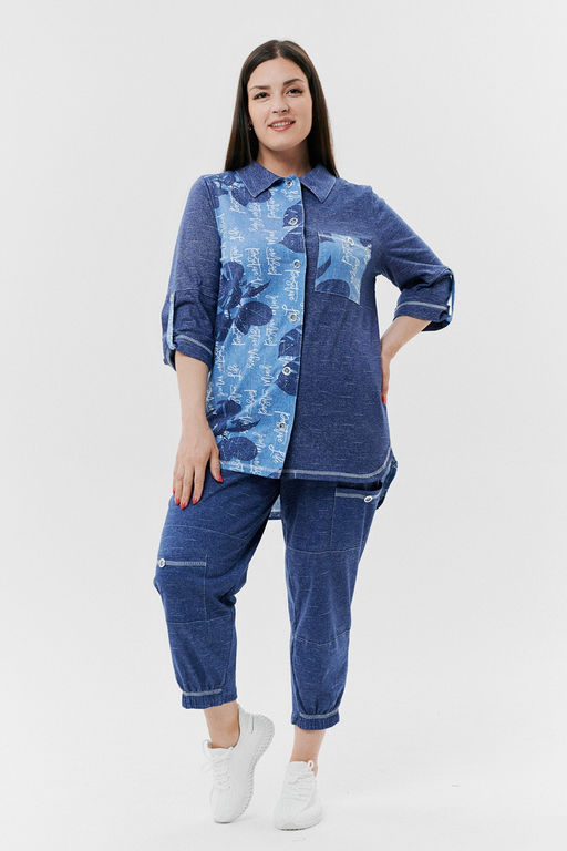 Туника женская прямого силуэта с отложным воротником. Застежка на петли-пуговицы. Рукав втачной, длина 3/4 с манжетой и хлястом. Низ туники фигурный, спинка несколько длиннее полочки. На полочке нагрудный карман.