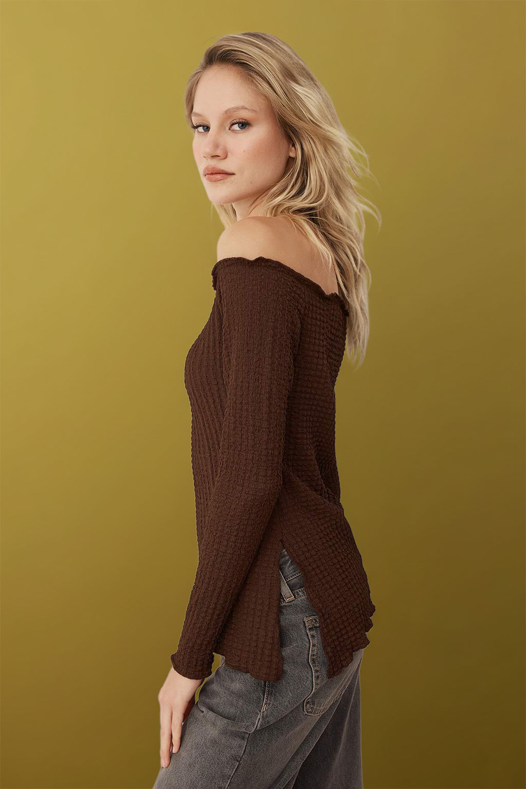Kahverengi Carmen Yaka Dokulu Etek Ucu Asimetrik Orme Bluz TWOAW26BZ00286