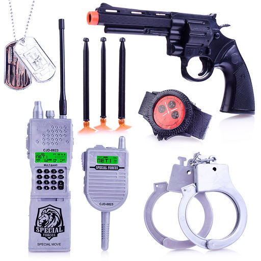 В наборе: пистолет с 3 патронами на присосках, наручники, часы, жетоны, рация и измерительный прибор.
