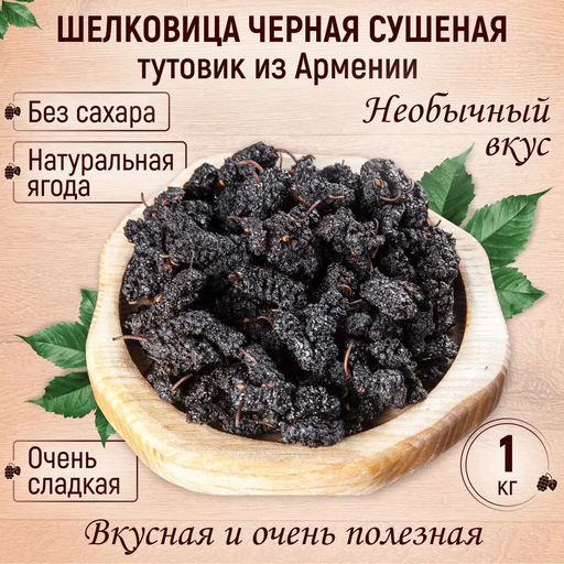 Наша шелковица сушёная чёрная достаточно крупная, некоторые ягодки достигают 3 см в длину. Она имеет насыщенный сладкий вкус и божественный аромат. Очень полезная, натуральная, получена методом естественной сушки, без сахара и без обработок.