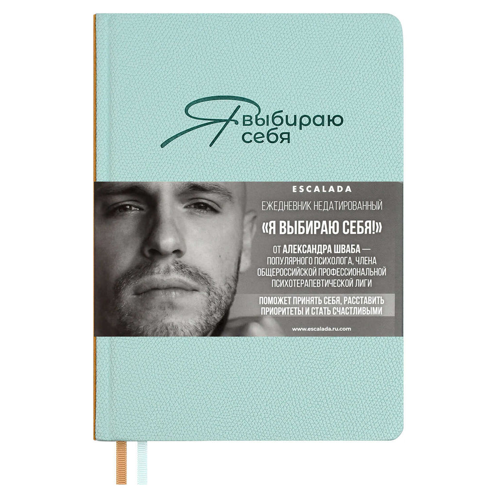 Ежедневник недатированный ESCALADA, #Я ВЫБИРАЮ СЕБЯ, А5, 160 л., арт. 70646/ 15 ДЖУТ МЯТНЫЙ (кожзам: 146x211 мм, твёрдый переплёт, материал обложки: искусственная кожа "Джут"; способ крепления блока: ниткошвейный; декор: аппликация из искусственной кожи, блинтовое тиснение; вн. блок: 160 л., кремовый офсет 70 г/м?, печать в две краски (линия), справочный материал: есть; перфорация углов блока: нет; отделка среза: окрашивание пантоном; закладка/-и: два ляссе, каптал: есть; форзац: печать пантоном, особенности: в блоке использованы действенные советы психолога, эксперта в когнитивно-поведенческой психотерапии, автора множества статей и канала Яндекс.Дзен Александра Шваба; персонализация возможна: да; индивидуальная упаковка: бандероль + ПЭТ-пакет)