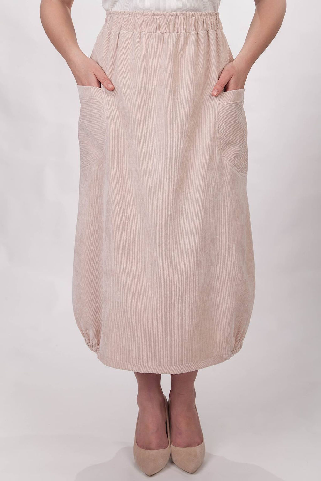 Юбка из вельвета, благодаря этому изделие не даёт усадку при стирке. Юбка женская из вельвета с притачным поясом на резинке, что обеспечивает дополнительный комфорт при носке.  Два накладных кармана.