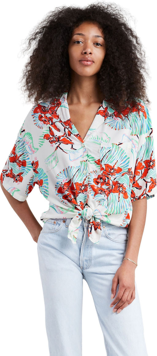 Женская летняя рубашка укороченного кроя с отложным двубортным воротником, нагрудным карманом, завязками по подолу и цветочным принтом.