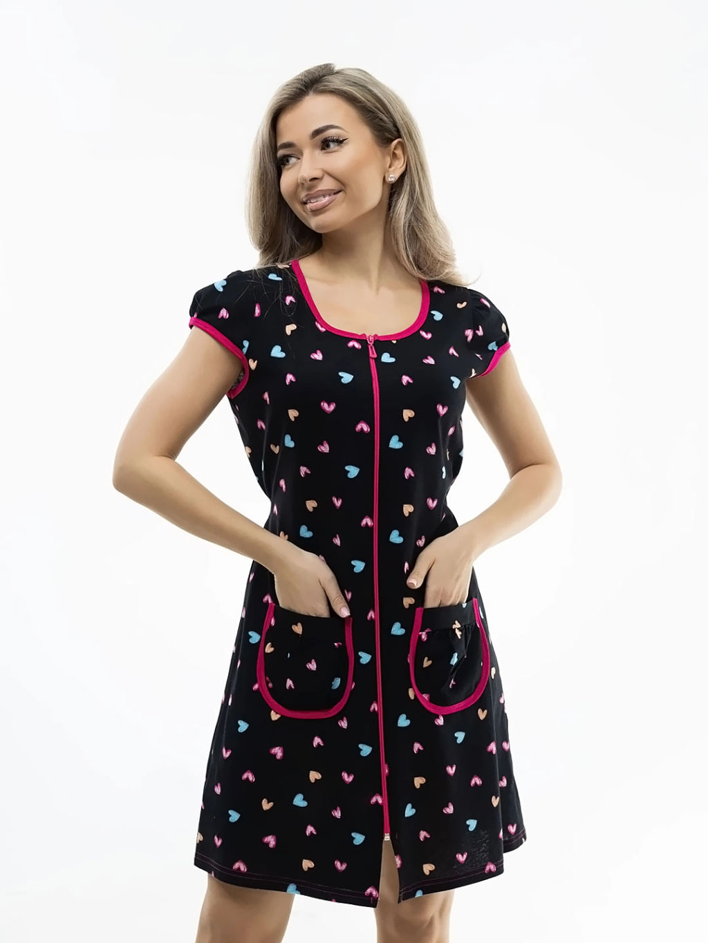 Халат женский полуприлегающего силуэта из трикотажного полотна кулирка длиной выше уровня колена. На полочке два накладных кармана со сборкой. Вырез горловины О-образный. Рукав крылышко-фонарик.­