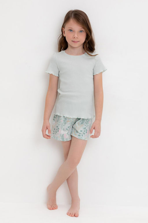 Трикотажная пижама из натурального хлопка. Футболка с короткими втачными рукавами изготовлена из эластичного трикотажа в рубчик. Шорты с эластичной резинкой в поясе выполнены из гладкого трикотажа супрем. Оригинальная набивка выполнена из стойких текстильных гипоаллергенных красителей. Изделие сохраняет цвет и форму после многократных стирок. Все трикотажные полотна производятся в соответсвии с нормами швейцарского сертификата ЭкоТекс.. Состав: 100% хлопок