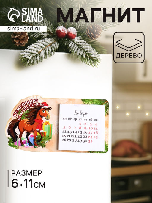 Этот магнит с символом 2026 года станет тёплым пожеланием семейного счастья и гармонии. Он создаёт в доме атмосферу уюта, напоминая о самом важном каждый раз, когда вы смотрите на холодильник. Календарь на весь год помогает легко планировать дела и значимые события для всей семьи.Подробнее о товареМагнит-календарь на 2026 год с изображением Лошади — символа года.Материал основы: дерево с качественной печатью.Компактный размер 6×11 см: не занимает много места, но всегда заметен.Надёжный магнит: крепко держится на любой металлической поверхности.Удобная календарная сетка: весь год на одном листе для лёгкого планирования.Идея и смыслЛошадь — символ энергии, верности и стремления вперёд. Такой магнит не просто организует пространство на кухне, но и становится вашим личным талисманом. Он несёт в себе пожелание благополучия, удачи и крепких семейных уз, превращая обычный предмет в значимый элемент домашнего обихода. Символ года: Символ года 2026 (Лошадь). Тематика праздника: Новый год. Бесплатная доставка: Да.
