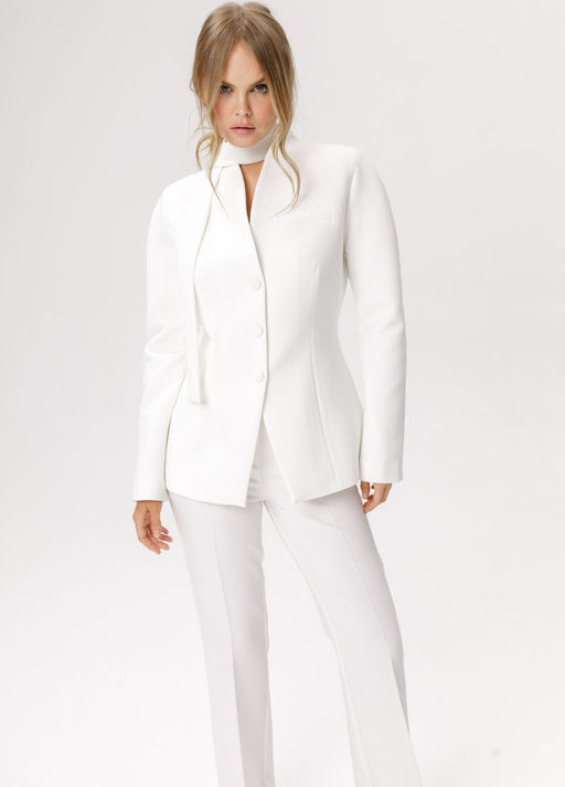 Приталенный жакет с акцентными плечами и воротником-стойкой.­
