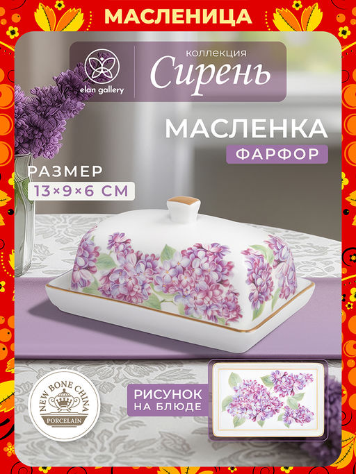 Масленка Elan Gallery "Сирень" 13,5х9х6,5 см выполнена из фарфора нового поколения new bone china. Высота без крышки 1,5 см, внутренний размер крышки 10,5х6,5х3,5 см. New bone china сочетает в себе изящность и высокую прочность. От классического костяного фарфора отличается большей экологичностью в производстве. Маслёнка поможет отпраздновать Широкую Масленицу со вкусом! Масленица это чудесный повод собраться за праздничным столом и насладиться тёплой атмосферой и традиционной русской кухней. В ассортименте бренда Elan Gallery вы найдёте предметы декора и красивую посуду для приготовления и сервировки масленичных блюд. Пусть Масленичная неделя принесет вам радость и множество вкусных моментов! Коллекция "Сирень" это посуда из белого фарфора с золотым окаймлением, вдохновлённая нежным весенним цветением. Чётко прорисованные детали и мягкая палитра фиолетовых оттенков так реалистично передают очарование цветущей сирени, словно её лёгкий аромат витает над вашим столом. Фарфоровое изделие создано для эстетичной подачи масла на стол во время завтрака или чаепития. При хранении в холодильнике сливочное масло не будет впитывать запахи других продуктов благодаря крышке. В фарфоровую ёмкость помещается кусок масла 10х5,5 см. Можно использовать в роли контейнера для кусочков сыра. В коллекции "Сирень" также представлены другие товары для сервировки стола и красивый кухонный инвентарь, что позволяет собрать сервиз на свой вкус. Не рекомендуется применять абразивные моющие средства. Нельзя использовать в микроволновой печи и посудомоечной машине. Поставляется в стильной коробке. Станет чудесным подарком на любой праздник. Благодаря красивой коробочке не понадобится подарочная упаковка. В ассортименте бренда Elan Gallery вы найдёте много красивых товаров для создания комфорта и уюта в доме и кухонных принадлежностей. Коллекция посуды "Сирень" от бренда Элан Галерея создаст весеннее настроение в вашем доме вне зависимости от сезона!
