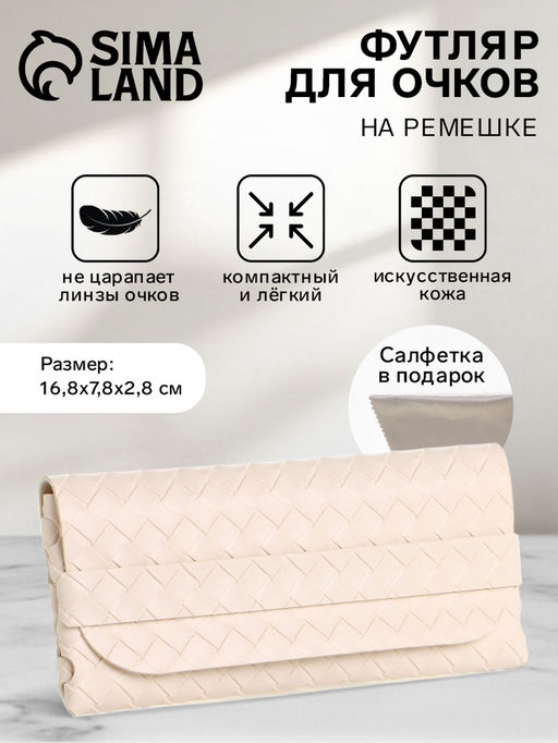 Стильный и практичный футляр для очков подойдет каждой женщине, предпочитающей элегантность и удобство. Выполнен из качественной искусственной кожи молочного оттенка, он станет надежным спутником ваших очков. Компактные размеры (16,8 см в длину и 7,8 см в ширину) и ремешок в качестве застежки обеспечивают комфортное использование.ПреимуществаЭргономичность: компактные размеры позволяют легко носить футляр в сумке или рюкзаке.Долговечность: материал устойчив к износу, обеспечивая долговременное использование.Удобство использования: мягкий и гибкий материал предохраняет очки от царапин.Стильный дизайн: молочный цвет подчеркивает изысканность и женственность вашего образа.Легкость: малый вес делает его практически невесомым при повседневном использовании.Надежность: плотно фиксирует очки, предотвращая их выпадение и повреждение.Универсальность: подходит для разных типов очков.Приятный на вид и ощущение, этот футляр станет незаменимым помощником в повседневной жизни. Вы будете уверены в безопасности своих очков и сэкономите на дорогостоящих ремонтах. Оцените удобство и надежность. Набор: Нет. Для кого: Для женщины. Длина, см: 16.5. Ширина, см: 7. Вид застёжки: Ремешок. Жёсткий корпус: Нет. Бесплатная доставка: Да. Размеры товара: 7.8/2.8/16.8. Примечание: Оттенок данного товара может незначительно отличаться от фото/видеоизображения (в зависимости от настроек яркости вашего экрана)..