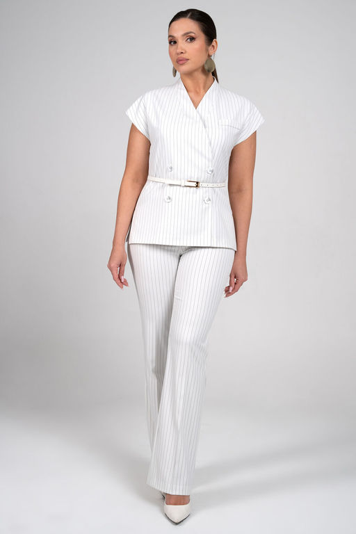 Жилет полуприлегающего силуэта, с двух-бортной застёжкой на петли, пуговицы и с внутренней застёжкой на петлю, пуговицу, со спущенной линией плеча, с разрезами по боковым швам, в дополнении ремень. Перед по левой части с верхним декоративным карманом. Воротник по переду цельнокроеная стойка переходящая на спинку.