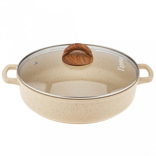 Жаровня с антипригарным покрытием 3,5л, д28см "Гармония", h7см, литые ручки, стеклянная крышка с пароотводом, пластмассовая ручка с покрытием "soft-touch" под дерево, "Оникс", подарочная упаковка (Россия)