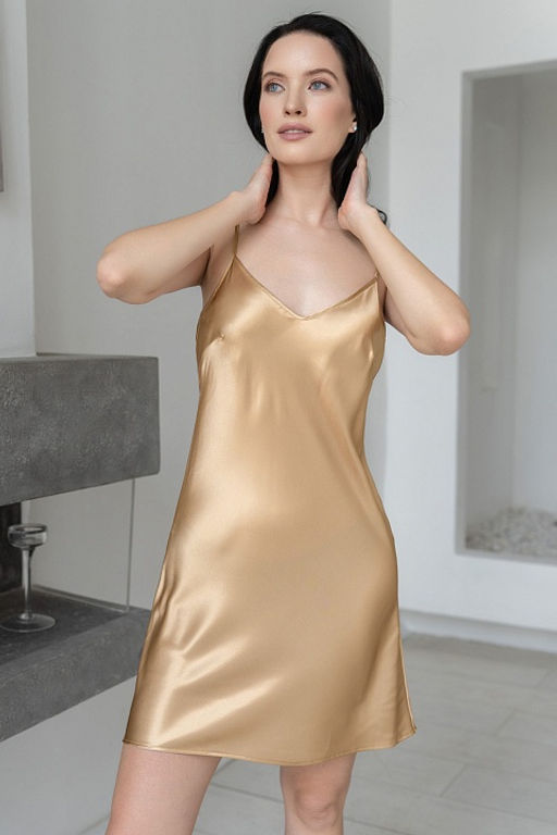 Короткая сорочка с вытачками Mia-Mella на груди на тонких бретелях выполнена из однотонного искусственного шелкового полотна с атласным блеском.­