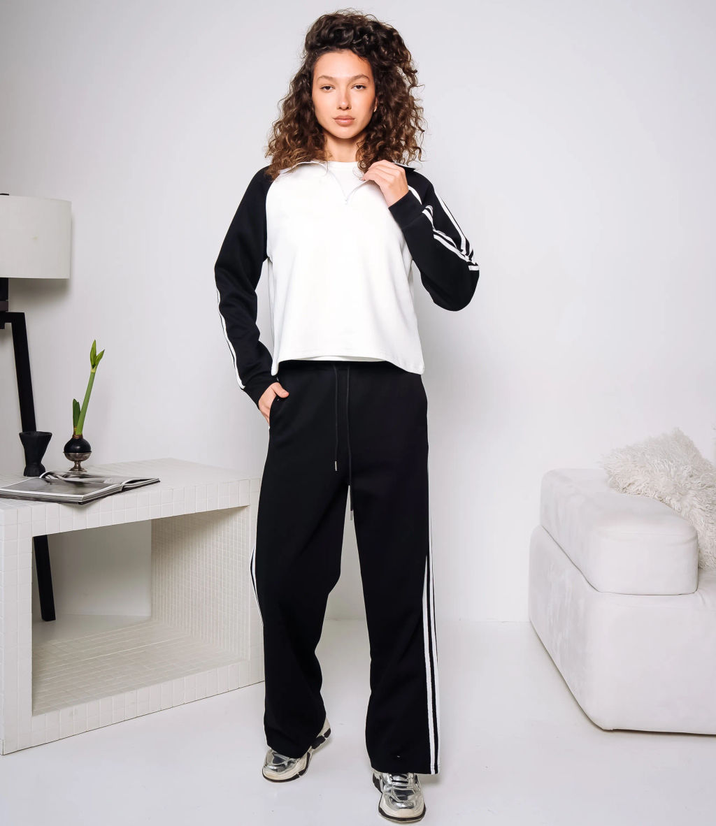 Спортивный костюм это одежда, которая подчеркивает стиль и комфорт каждой женщины. Спортивный костюм из плотного трикотажа с укороченной толстовкой и прямыми свободными брюками; толстовка имеет высокий круглый ворот с короткой центральной молнией-замком, втачные реглановые рукава с контрастными продольными тесьмами вдоль наружной стороны и манжетами в рубчик, низ изделия слегка укорочен и оформлен простым подгибом; брюки с средней или слегка высокой посадкой, широкий эластичный пояс с наружным шнурком для регулировки. Для изготовления использованы ткани 95% хлопок и 5% спандекс, который характеризуются отличным качеством и дышащими свойствами. Даже после множества стирок изделие не утратит первоначальной красоты. Вы будете носить его с радостью. Обратите внимание на цвет. Он полностью соответствуют фотографии на сайте. Чтобы вы были уверены в размере, мы представили на странице таблицу. Воспользовавшись ею, вы сможете сами обмерить себя и удостовериться. Установленная нами цена является приемлемой. Не откажите себе в удовольствии быть стильной и комфортной! -- Характеристики -- Цвет: черный Пол: Женский Страна производитель: Корея Сезон: Демисезон Материал: Хлопок, Спандекс