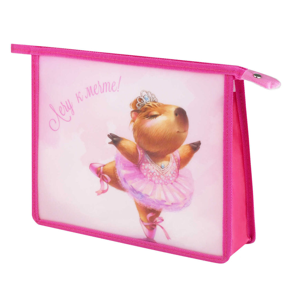 Папка для школьных тетрадей пластиковая Феникс+, арт. 72357/ 12 КАПИБАРА-БАЛЕРИНА (полипропилен, формат А5, 23.3x20х6.5 см, 1 отделение (-я), молния, дно с расширением, пластик с глиттером, УФ-печать)