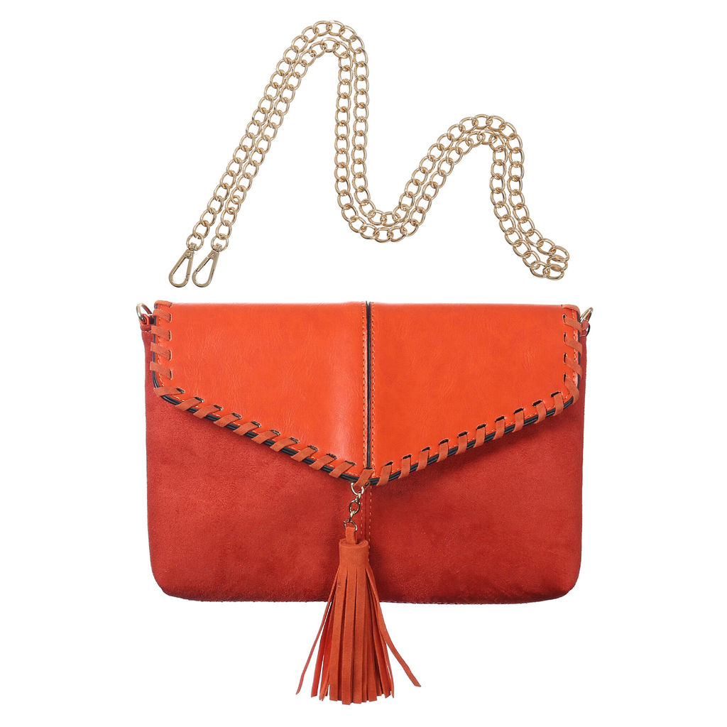 Классический клатч-конверт из искусственной замши яркого оранжевого цвета. Декорирован пушистой кистью из аналогичеого материала. Застежка - кнопка. В комплекте есть длинная цепочка, которая позволяет носить клатч также и на плече. Внутри одно отделение и один карман на молнии. Размер:18 * 25 см