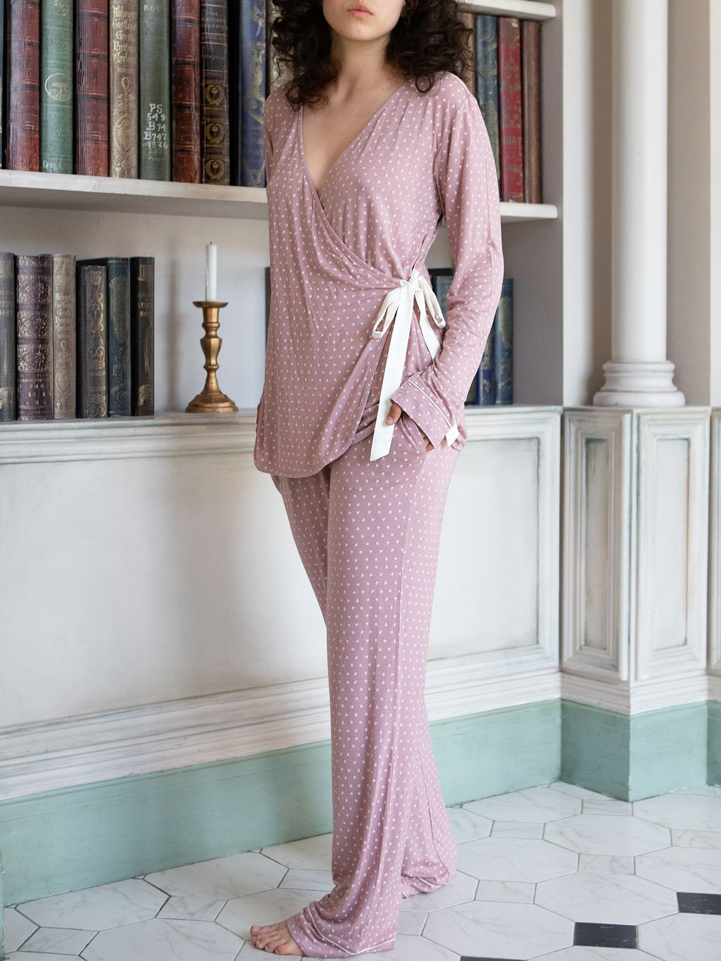 Женская пижама: блуза и брюки из вискозного трикотажа пудрового цвета с мелким светлым принтом. Струящийся силуэт прямых брюк на резинке и блузы с запАхом располагает к отдыху и релаксу. В брюках удобные боковые карманы. Блуза украшена атласным кантом и большим бантом-завязкой в тон цвета принта, который освежает и украшает комплект.